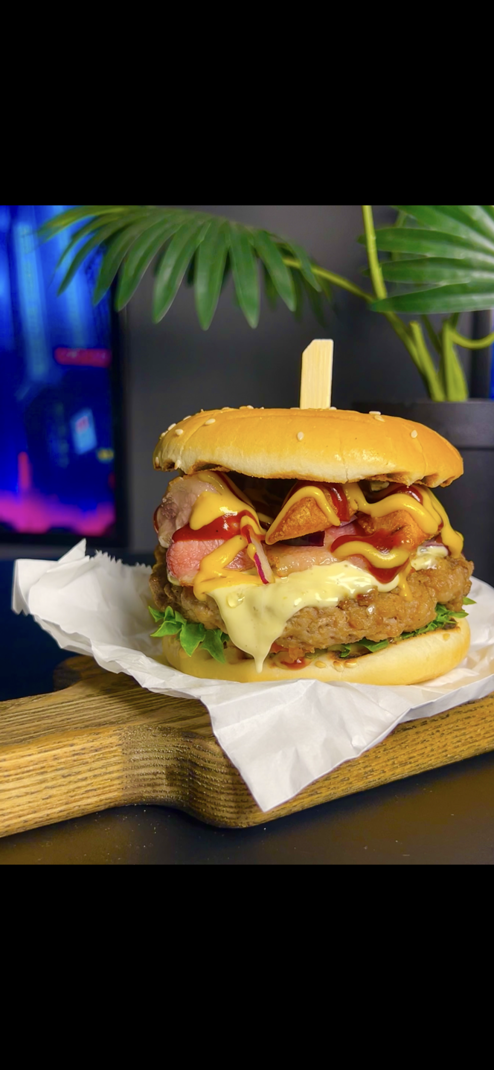 Булочка, котлета, картошка по деревенски, мар огурцы, свежий помидор, фрилис, красный лук, соус чесночный , горчичный , BBQ